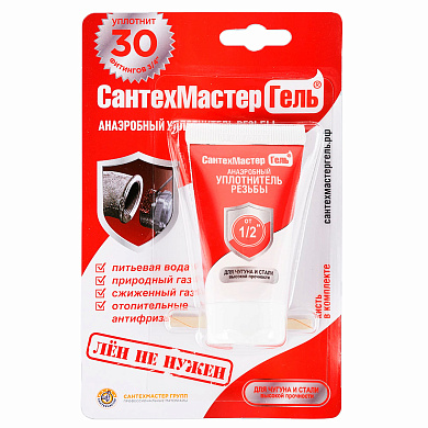 Красный Сантехмастер Гель для чугуна и стали используется для соединения труб диаметром от 1/2 дюймов. Герметизация с помощью этого геля-герметика настолько сильная, что при демонтаже соединение приходится подогревать. Состав рекомендуется использовать там, где необходим срочный запуск системы (общее время полимеризации геля не превышает 5 минут) при температуре окружающей среды от + 5 °C. Ближайшие конкуренты позволяют работать со своими анаэробными герметиками при температуре от + 15 °C.