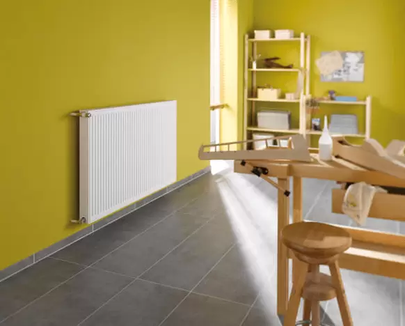 Компактный профильный панельный радиатор Profil-V с нижним правым видом подключения, со встроенным термовкладышем. Две греющие панели и два конвекционных элемента.