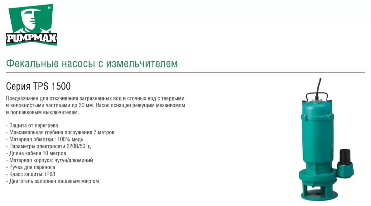 Насос фекальный с режущим механизмом TPS1500 Pumpman предназначен для откачивания загрязненных и сточных вод с твердыми и волокнистыми частицами до 20 мм. Насос оснащен режущим механизмом и поплавковым выключателем.