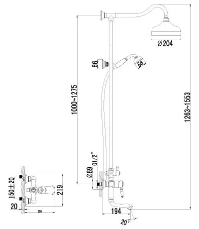 Смеситель для ванны и душа с регулируемой высотой штанги, поворотным изливом и верхней душевой лейкой "Тропический дождь"