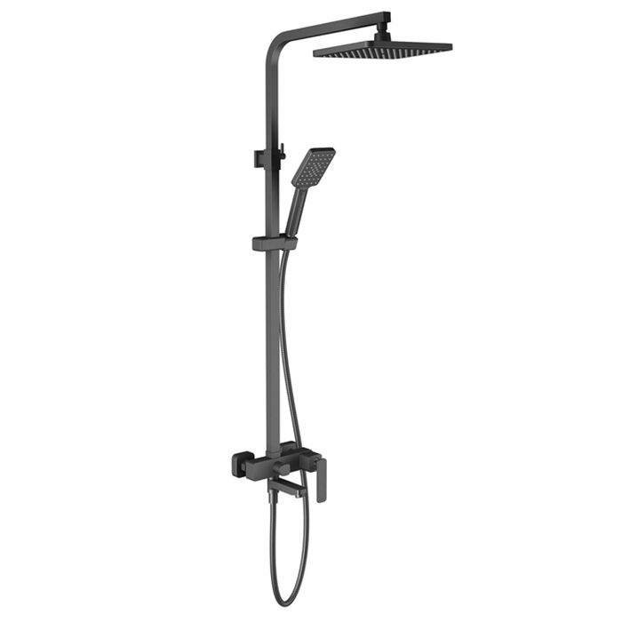 Душевая система для ванной с прямоугольной лейкой в стиле модерн. Душевая система сделана из латуни класса А. У данной модели поворотный излив. Поворот излива обеспечивает переключение потока воды с излива на лейки. Излив поворачивается вправо на 90°.