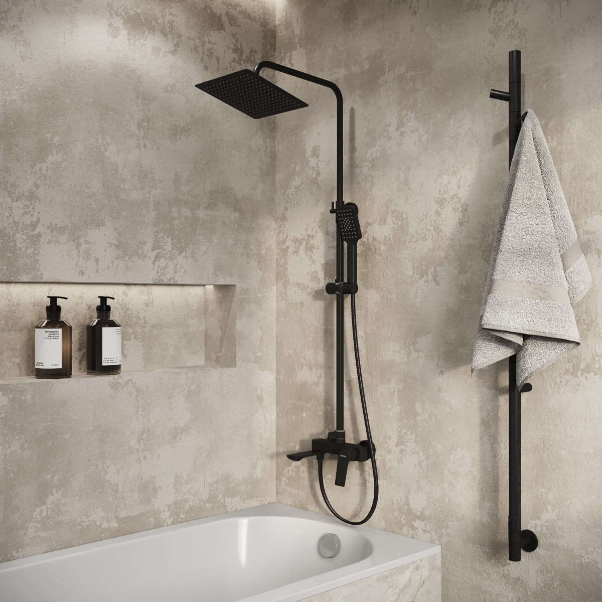 Душевая стойка Cosmo 500.K35.02.210 ТМ GROSSMAN в черном матовом исполнении с тропическим душем, лейкой и изливом - это идеальное сочетание высокого качества и доступной цены. Она подходит для установки в душевых углах, перегородках, а так же над ванной. Ключевые особенности: