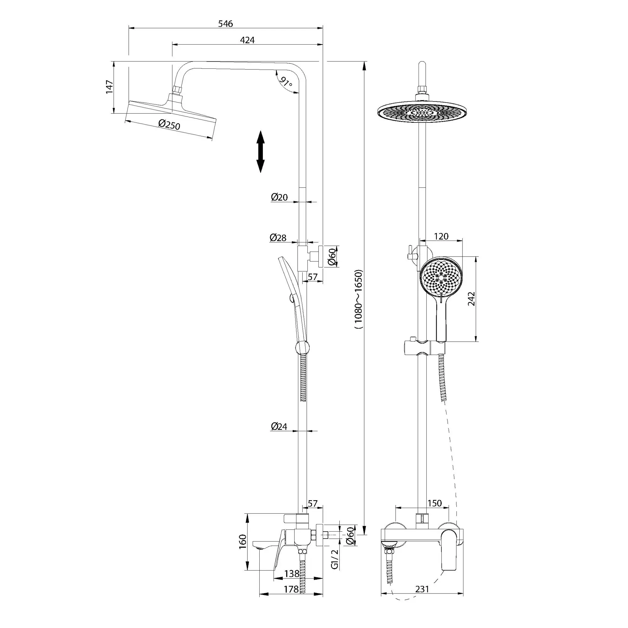 Телескопическая душевая стойка позволяет изменять высоту до 165 см, что делает использование комфортным для людей разного роста.