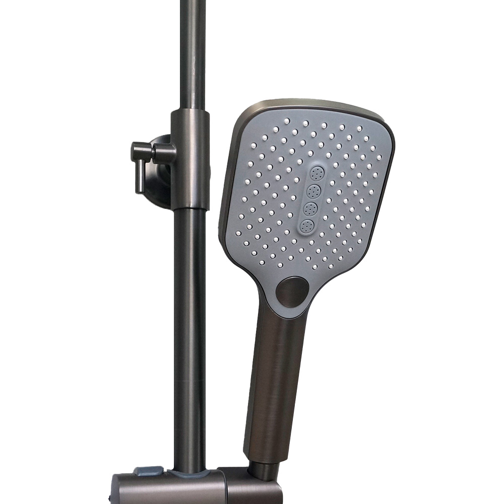 Конструкция душевой системы состоит из крепежной штанги из нержавеющей стали марки 304, ручной лейки, прочного литого корпуса смесителя, держателя для лейки, а также верхнего тропического душа.