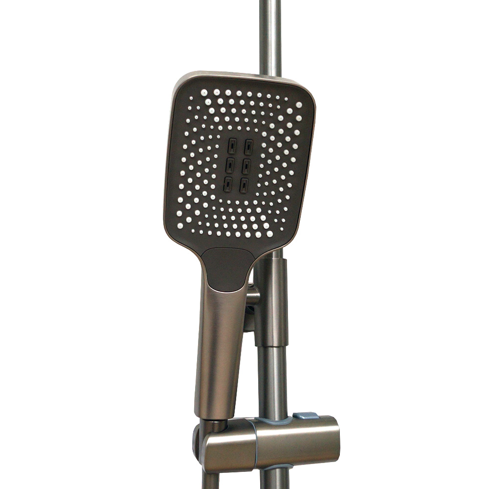 Конструкция душевой системы состоит из крепежной штанги из нержавеющей стали марки 304, ручной лейки, прочного литого корпуса смесителя, держателя для лейки, а также верхнего тропического душа.