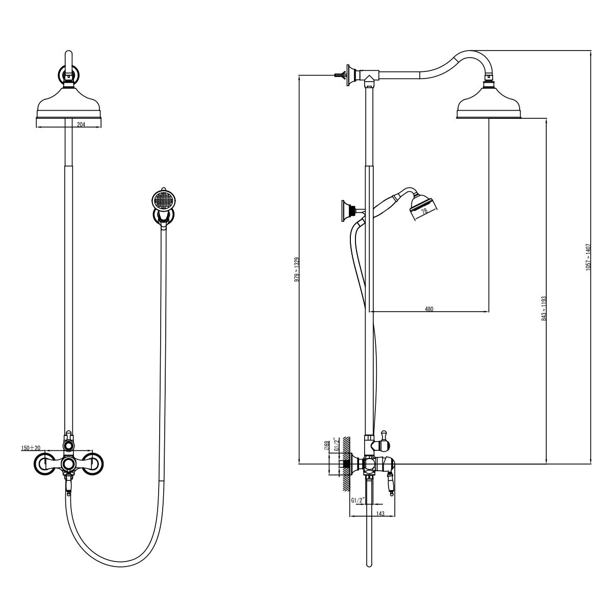 - Аксессуары в комплекте (верхняя душевая лейка «Тропический дождь» Ø204 мм, 1-функциональная лейка Ø78х215 мм, настенное поворотное крепление для лейки, душевой шланг 1,5 м)