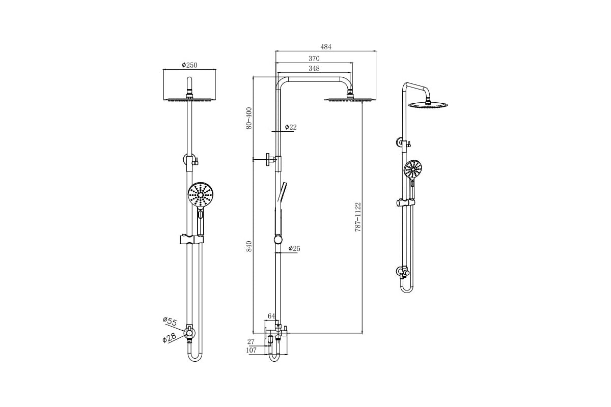 • регулируемая душевая штанга из нержавеющей стали, выдвигающаяся до 1122 мм в высоту