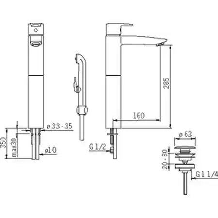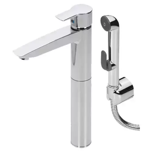 Oras Cubista 2802 - уникальный высокий смеситель для раковины с ручным душем Bidetta, с подводкой из медных трубок и донным клапаном.