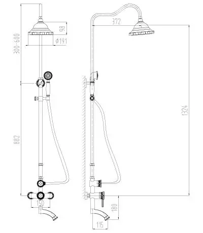 Смеситель для ванны и душа с регулируемой высотой штанги, поворотным изливом и верхней душевой лейкой "Тропический дождь"