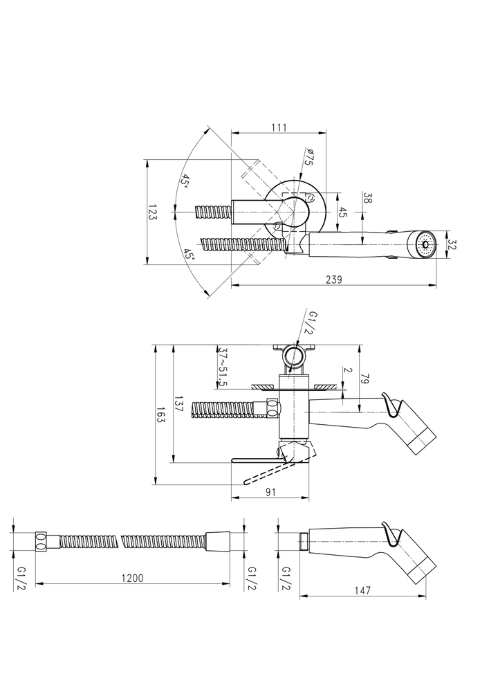Комплектация рукоятка, лейка гигиенического душа, подключение для шланга, шланг в металлической оплетке 1/2" 120см, паспорт изделия с гарантийным талоном, инструкция по эксплуатации.