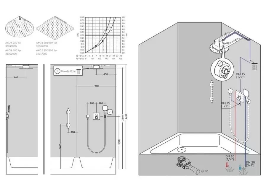 1 тип струи: PowderRain (благодаря маленькому диаметру и большому количеству форсунок создаются тончайшие и легчайшие струйки с тысячами микрокапель, которые мягко окутывают тело). Расход воды PowderRain (при 3 барах): 18 л/мин.