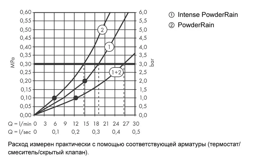 - расход воды в режиме Intense PowderRain (при 3 барах): 15 л/мин