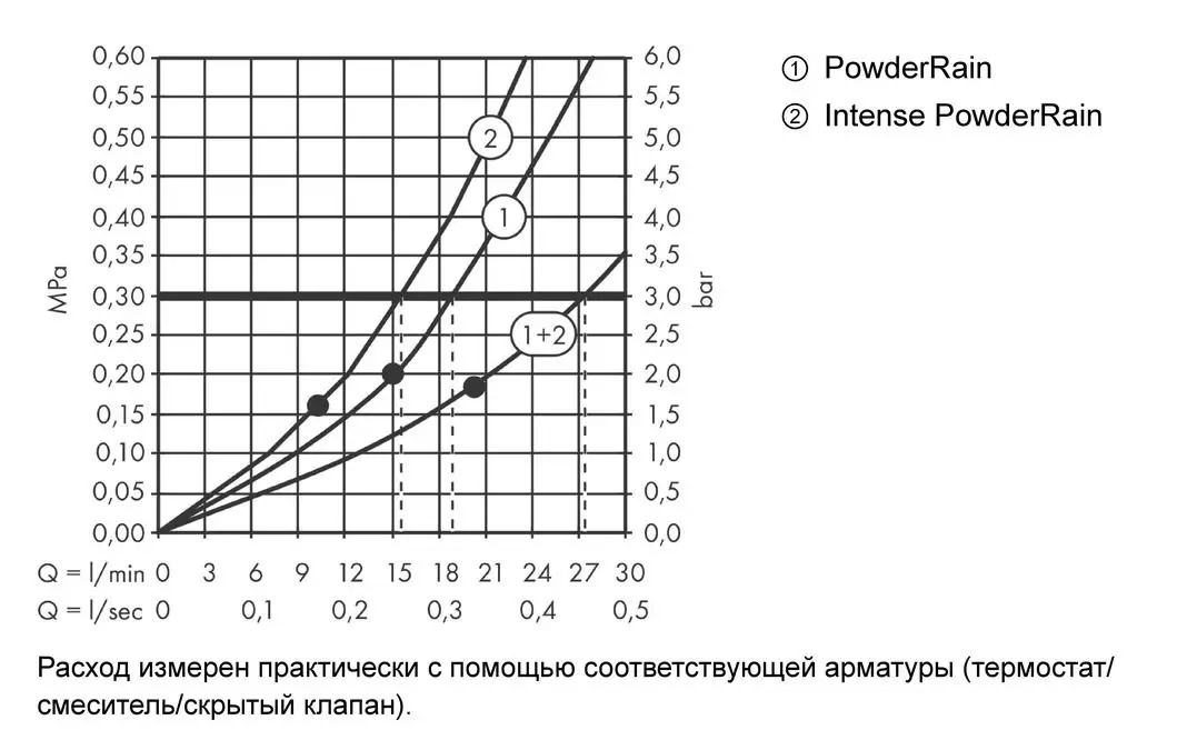 - расход воды в режиме Intense PowderRain (при 3 барах): 16 л / мин