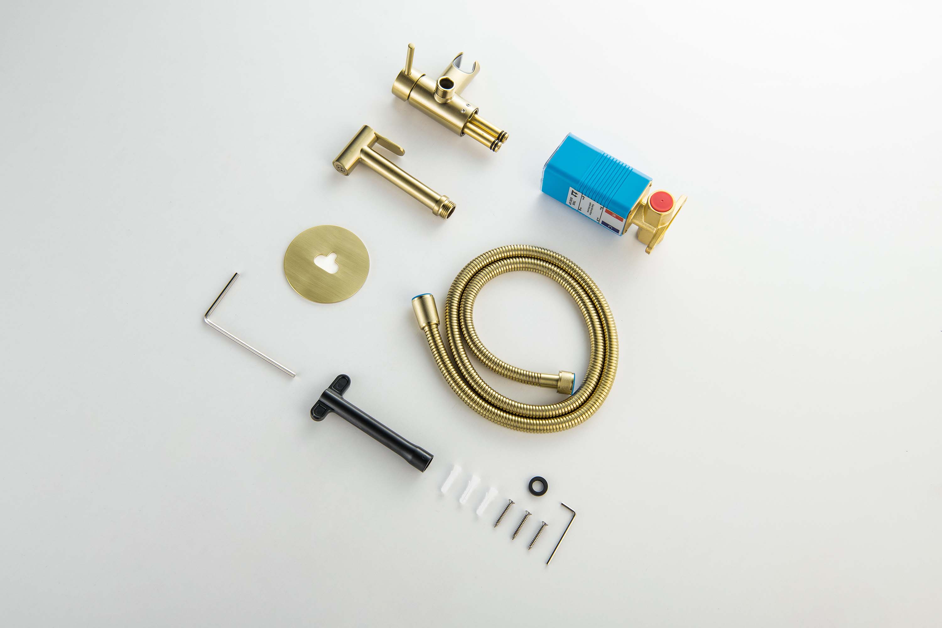 • Душевой гарнитур: гигиеническая лейка, шланг, шланговое подсоединение с держателем