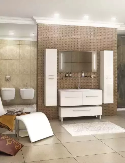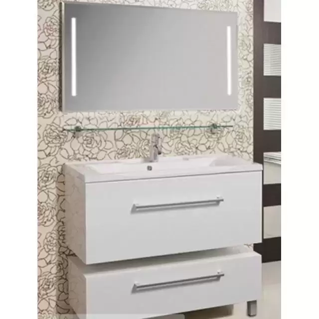 Облегченный вариант комплектации – зеркало Отель 100 – с подсветкой и системой ANTI-STEAM. Дополнительно выпускается комод с откидным фасадом, устанавливаемый на ножках. В навесном шкафу за фасадом расположены стеклянные полки и два выдвижных ящика для мелких предметов. При желании комплект с зеркалом можно дополнить стеклянной полкой.
