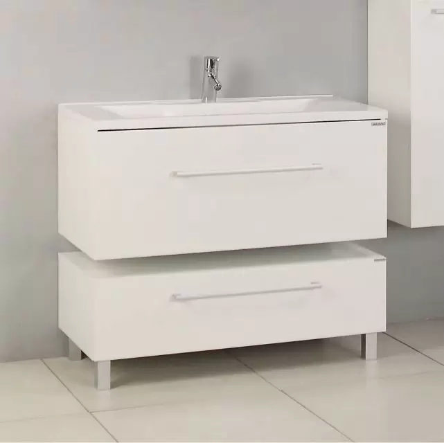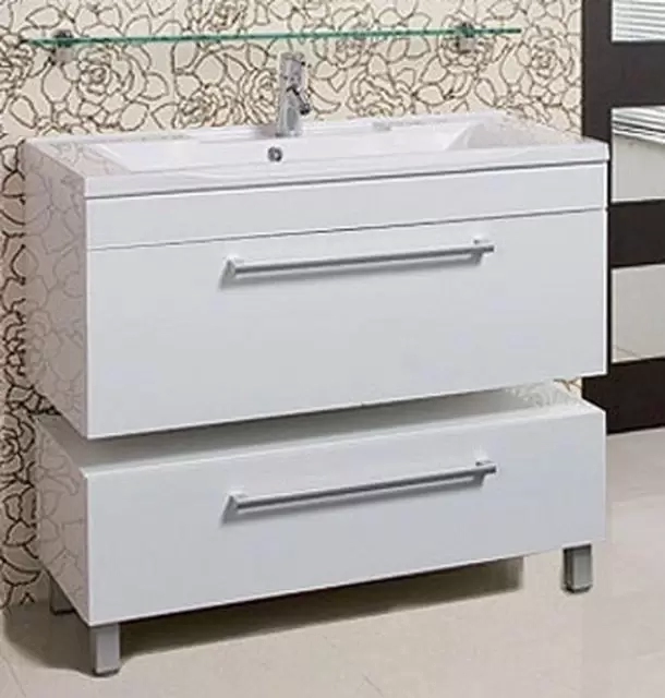 Удобный и практичный комод с ящиком, на ножках. Конструкторское решение, воплотившееся в лаконичных прямолинейных формах комода, превращает пространство обычной ванной комнаты в территорию стиля и красоты.