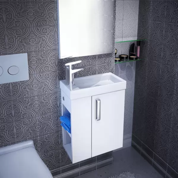 Коллекция Torr специально разработана для маленьких санузлов, где используется смеситель с гигиеническим душем: в боковой части тумбы размещено кольцо для выхода шланга, держатель гигиенической лейки может располагаться на самой боковой панели тумбы или на стене рядом. Мебель Torr – сочетание стиля, практичности и функциональности: минималистичный дизайн тумбы дополнен современным прямоугольным умывальником, вместительными открытыми полками, удобной плоской ручкой. Практичный белый цвет фасадов делает коллекцию универсальной – она подойдет к интерьеру в любом стиле.