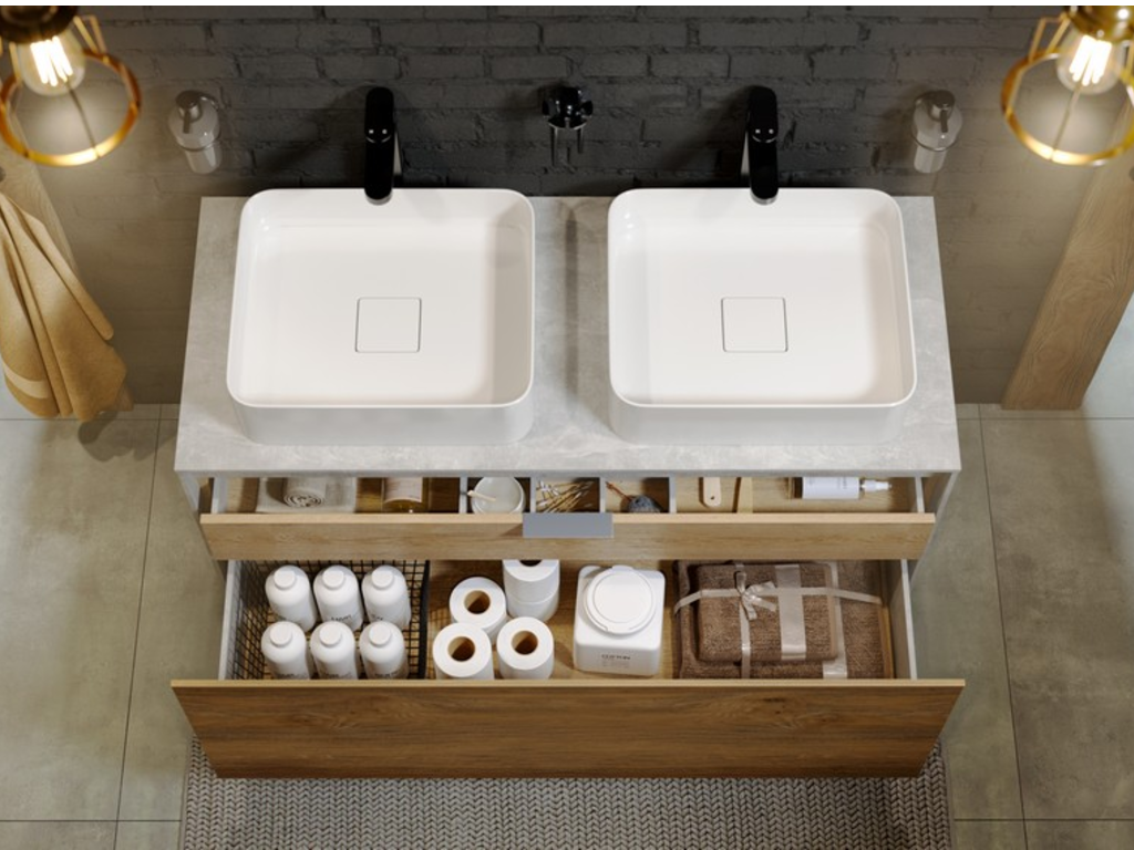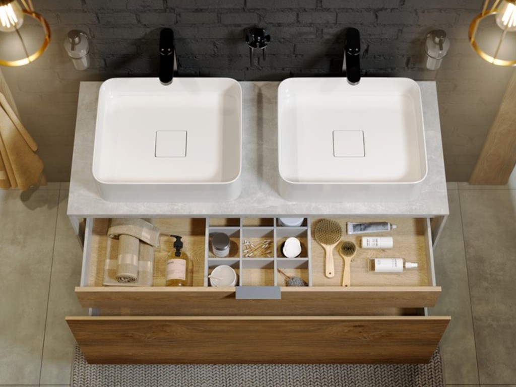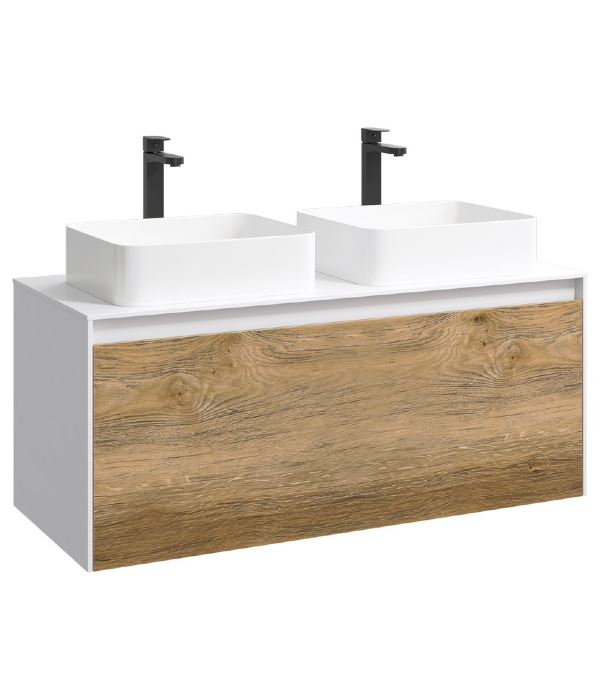 Подвесная тумба 120 см с двумя ящиками: основной и внутренний, скрытый за фасадом. Цвет белый/дуб балтийский; с умывальником