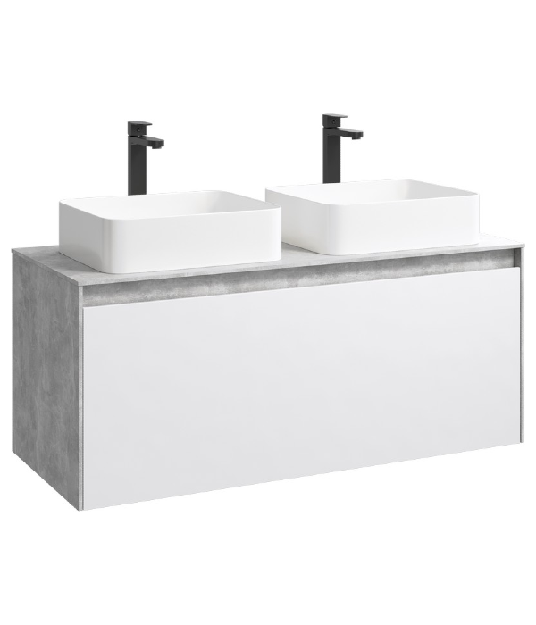Подвесная тумба 120 см с двумя ящиками: основной и внутренний, скрытый за фасадом. Цвет бетон светлый/белый; с умывальником