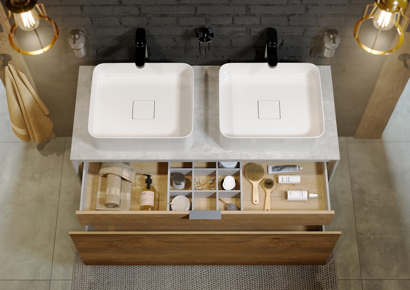 Подвесная тумба 120 см с двумя ящиками: основной и внутренний, скрытый за фасадом. Цвет дуб балтийский; с умывальником