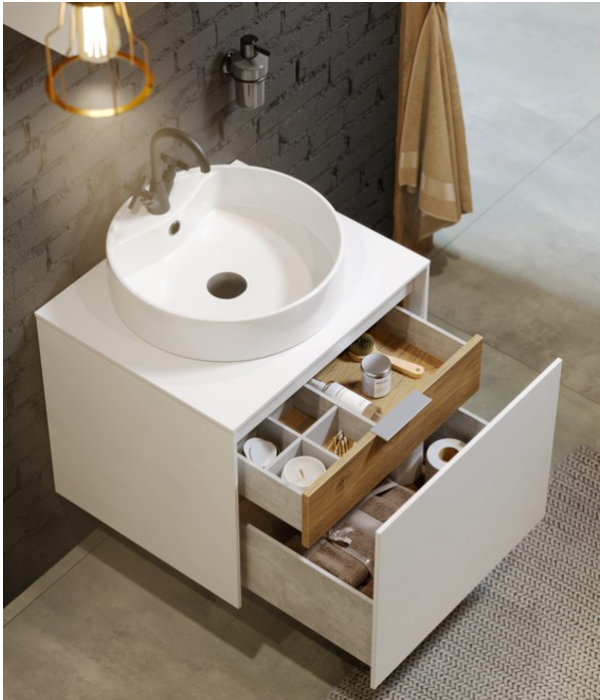 Подвесная тумба 60 см с двумя ящиками: основной и внутренний, скрытый за фасадом. Цвет бетон светлый; с умывальником