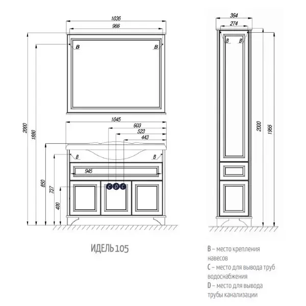 В напольной колонне полки расположены как за верхним, так и за нижним фасадами. Петли у фасадов расположены справа. Между этими отделениями расположен выдвижной ящик.