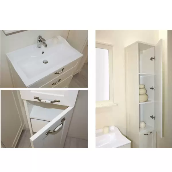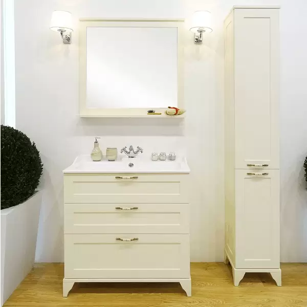 Модель ЛЕОН доступна и в напольном исполнении. Тумба дополнительно снабжена надежными мебельными навесами. В тумбе установлены 3 ящика, и, помимо стандартного подключения водоснабжения и канализации (из стены), предусмотрена возможность подключения труб снизу. Тумба комплектуется раковиной из литого мрамора собственного производства АКВАТОН. Изящные формы, пристенные бортики и площадки делают ее очень удобной. На изящной полочке зеркала можно разместить мелочи, которые всегда должны быть под рукой.