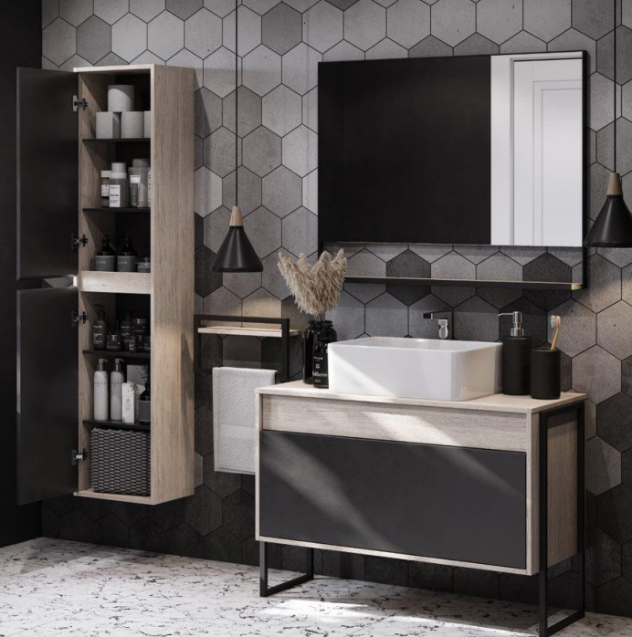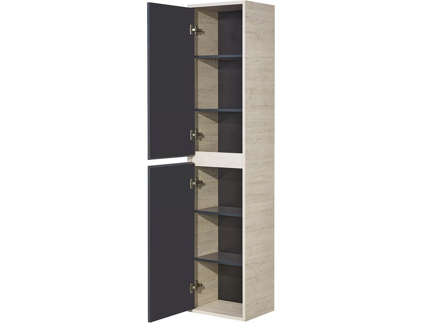 В качестве дополнительного места для хранения можно использовать шкаф-колонну с двумя отделениями. Фасады, как и у тумбы, выполнены в цвете графит с эффектом perfect touch и снабжены удобными интегрированными ручками. За фасадами находятся полочки, на которые можно разместить все необходимые принадлежности. Верхняя и нижняя полки имеют возможность регулировки по высоте.