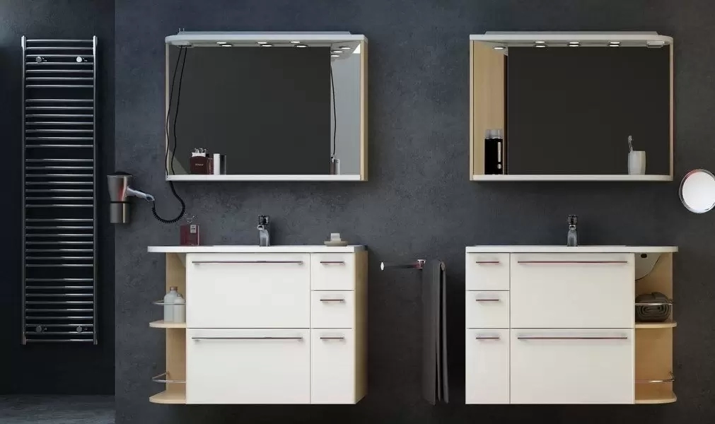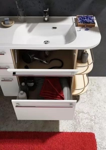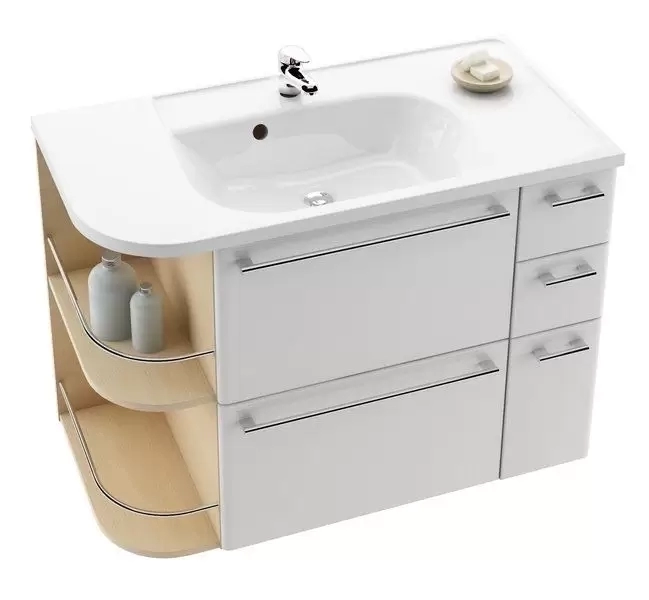 Тумба со встроенной корзиной для белья, тремя ящиками, отделением с откидной дверцой и автоматической доводкой, предназначена для умывальника Praktik S (96 см).