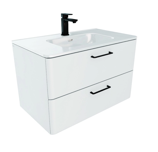 Тумба с умывальником для ванной комнаты, подвесная. Размеры тумбы без умывальника: 467х802х500 мм (ДхШхВ). Размеры умывальника: 460х800 мм (ДхШ). Фасад МДФ 19 мм в эмали (белый глянец). Корпус влагостойкий ВЛДСП 16 мм в эмали. Ручки - цвет состаренное олово. Два выдвижных ящика с механизмом плавного доведения. Пластиковый ограничитель под сифон в верхнем ящике. Перекатной организатор в нижнем ящике. Навесы усиленные с планкой.