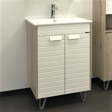 - Напольная тумба-умывальник с двумя створками, оснащенными петлями с плавным закрыванием. Фасады тумбы окрашены белой матовой эмалью. На фасадах - фрезеровка горизонтальными полосами. Тумба оснащена декоративными ножками в одном стиле с ручками створок.