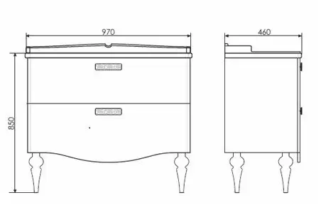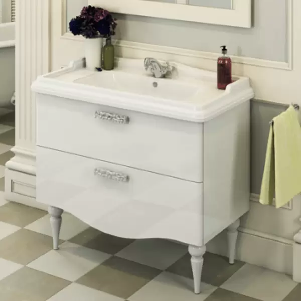 Тумба-умывальник в неоклассическом стиле с двумя широкими выкатными ящиками. Ящики оснащены системой с плавным закрыванием. Фасады тумбы покрыты белой глянцевой эмалью. Тумба укомплектована широкой и глубокой раковиной в классическом стиле с бортиком.