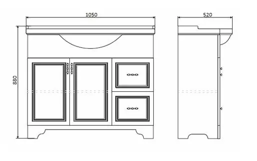 Широкая тумба-умывальник с большим выбором для хранения принадлежностей для умывания и бытовой химии. Тумба с двумя распашными дверцами и двумя ящиками. Створки оснащены петлями с плавным закрыванием. За створками горизонтальная полка. Фасады и корпус покрыты эмалью оттенка слоновая кость.