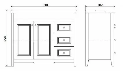 Тумба-умывальник в традиционном стиле с двумя створками и тремя ящиками. Створки оснащены петлями с плавным закрыванием. Фасады тумбы из МДФ покрыты белой глянцевой эмалью. Тумба укомплектована оригинальной прямоугольной раковиной с бортиком по периметру.