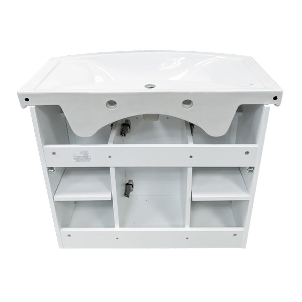 - Напольная тумба-умывальник с тремя створками оснащенными системой плавного закрывания. У левой створки и центральной петли справа. У правой створки петли слева. Фасады и боковины тумбы покрыты белой глянцевой эмалью. Ножки из массива дерева.