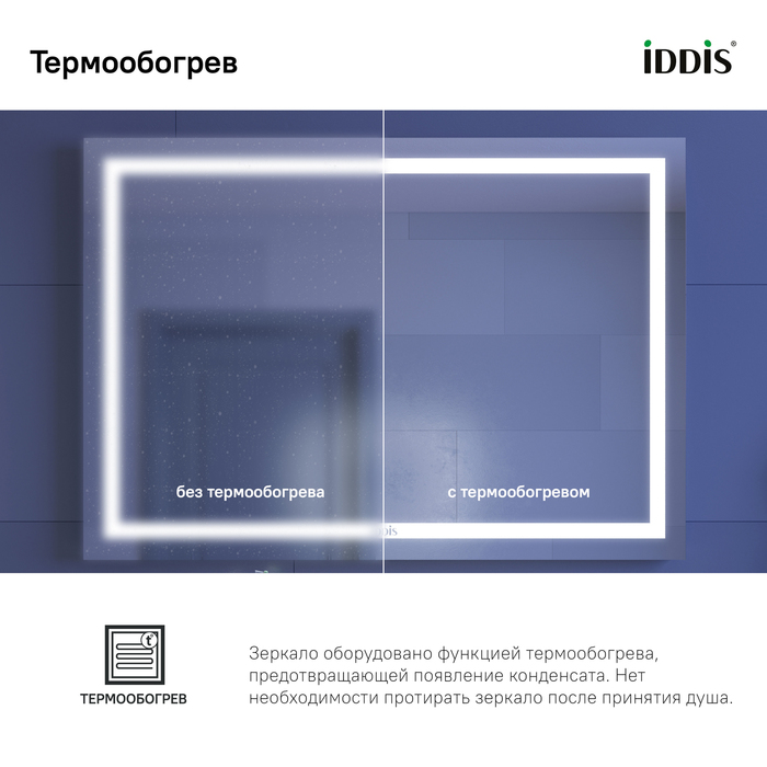 • Зеркало IDDIS® оборудовано функцией термообогрева, предотвращающей появление конденсата. Это избавит от необходимости протирать зеркало после принятия душа.