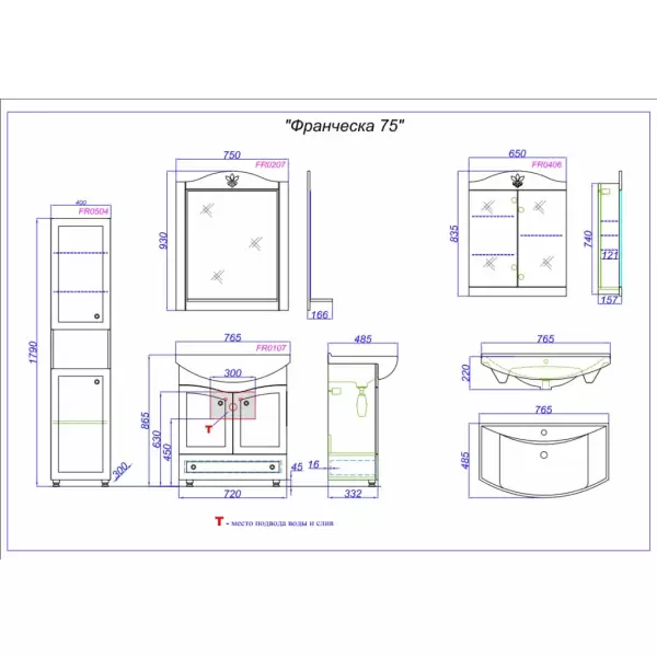 Фасады коллекции производятся из МДФ (древесново-локнистой плиты повышенной плотности) и покрыты 5-ю слоями белой глянцевой эмали. Боковины из ЛДСП (древесностружечной плиты повышенной плотности) – также имеют белую глянцевую поверхность. Коллекция представлена напольными тумбами в четырех размерах: 65, 75, 85 и 105 см по ширине. Гарнитуры комплектуются керамическими умывальниками производства завода «KIROVIT» – коллекция Стиль. Для удобства открывания тумб используются хромированные металлические ручки с керамическими вставками итальянского производителя BosettiMarella. Нижний ящик в тумбах 65,75 и 85 см оснащен скрытыми направляющими австрийской фирмы Blum с системой мягкого закрывания, на которые производитель дает вечную гарантию. На все двери установлены петли с интегрированным доводчиком, обеспечивающим плавное закрывание.