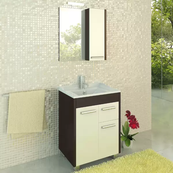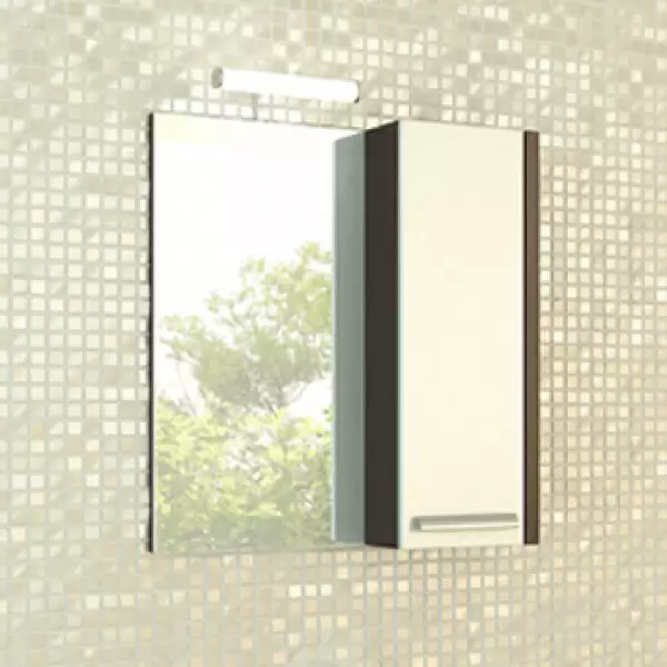Створка оснащена петлями с плавным закрыванием. Высококачественное зеркальное полотно с амальгамой на основе серебра. Дополнительно оснащается светильником. Фасад окрашен белой глянцевой эмалью, боковые стенки из ЛДСП цвета венге.