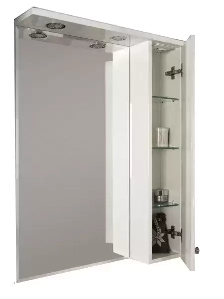 Зеркальный шкаф с тремя стеклянными полочками и двумя галогеновыми светильниками. Розетка и выключатель расположены за створкой.