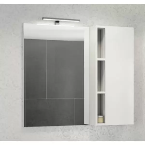 - Зеркальное высококачественное полотно с амальгамой на основе серебра. Створка мебельного элемента оснащена петлями с плавным закрыванием. За дверцей одна горизонтальная полка. Фасад покрыт белой глянцевой эмалью