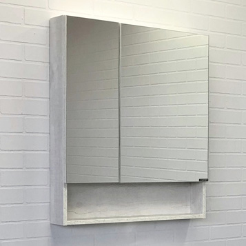 - Створки оснащены петлями с плавным закрыванием. Высококачественное зеркальное полотно с амальгамой на основе серебра. Обе боковые створки зеркала открываются наружу. За широкой створкой две горизонтальные полки, за узкой одна. На нижней внешней полке можно расположить невысокие принадлежности для умывания.