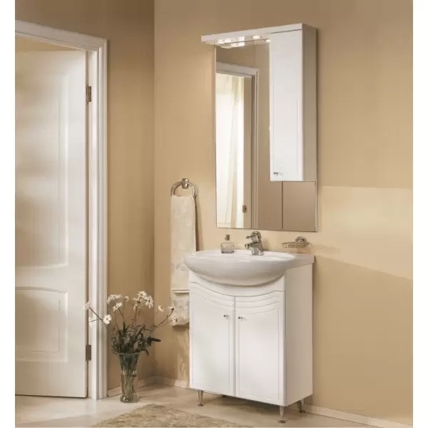 Модель выполнена в традиционном стиле – строгий лаконичный дизайн и ничего лишнего. В тумбе, которая установлена на регулируемые ножки, за распашными фасадами установлена полка, высоту расположения которой можно менять. Зеркало снабжено шкафчиком для мелких предметов и верхней панелью с подсветкой. Дополнительный функционал обеспечивает шкаф-колонна – вверху распашной фасад с регулируемыми по высоте полками, в центре два ящика, а внизу – удобная бельевая корзина.