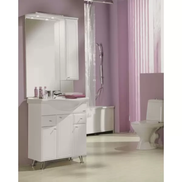 Эта модель предназначена для ванных комнат среднего размера и обладает всем, что необходимо для наведения порядка. В тумбе слева и справа вверху – по небольшому ящику, а внизу и в центре – ниши с регулируемыми по высоте полками. Большое зеркало оснащено подсветкой, встроенной в верхнюю панель, розеткой, выключателем и шкафчиком с полочками.