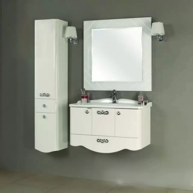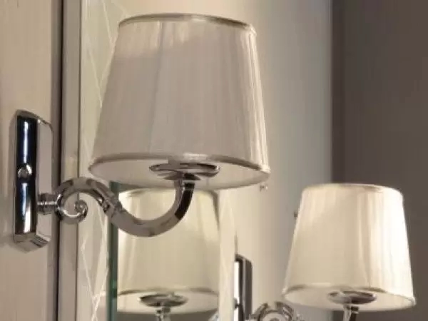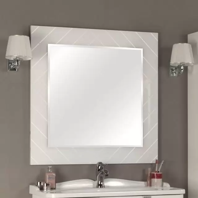 Прямоугольное зеркало шириной 90см с белым обрамлением зеркального полотна - декоративной гравировкой с характерными элементами неоклассики. Дополняется двумя изящными хромированными светильниками итальянского производства.