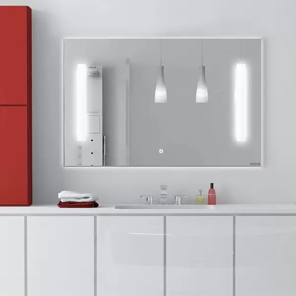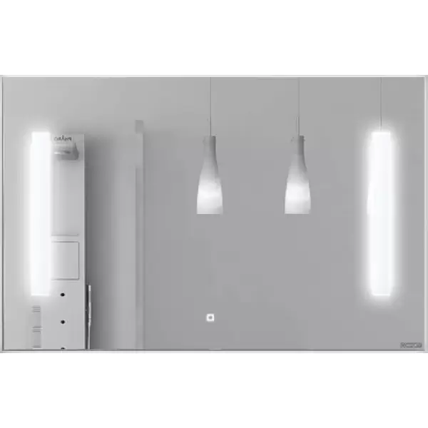 Зеркальное высококачественное полотно с амальгамой на основе серебра. Зеркало оснащено светодиодной подсветкой в виде двух вертикальных полос по краям полотна, и сенсорным выключателем