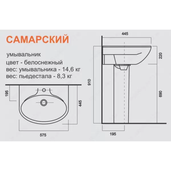 Умывальник Самарский без отверстия с пьедесталом Самарский SANITA.