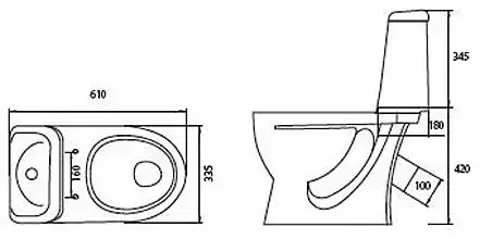 Унитаз имеет чашу овальной формы, косой (под углом) выпуск, подвод воды в бачок осуществляется снизу. В комплект унитаза входит также бачок и крепления.