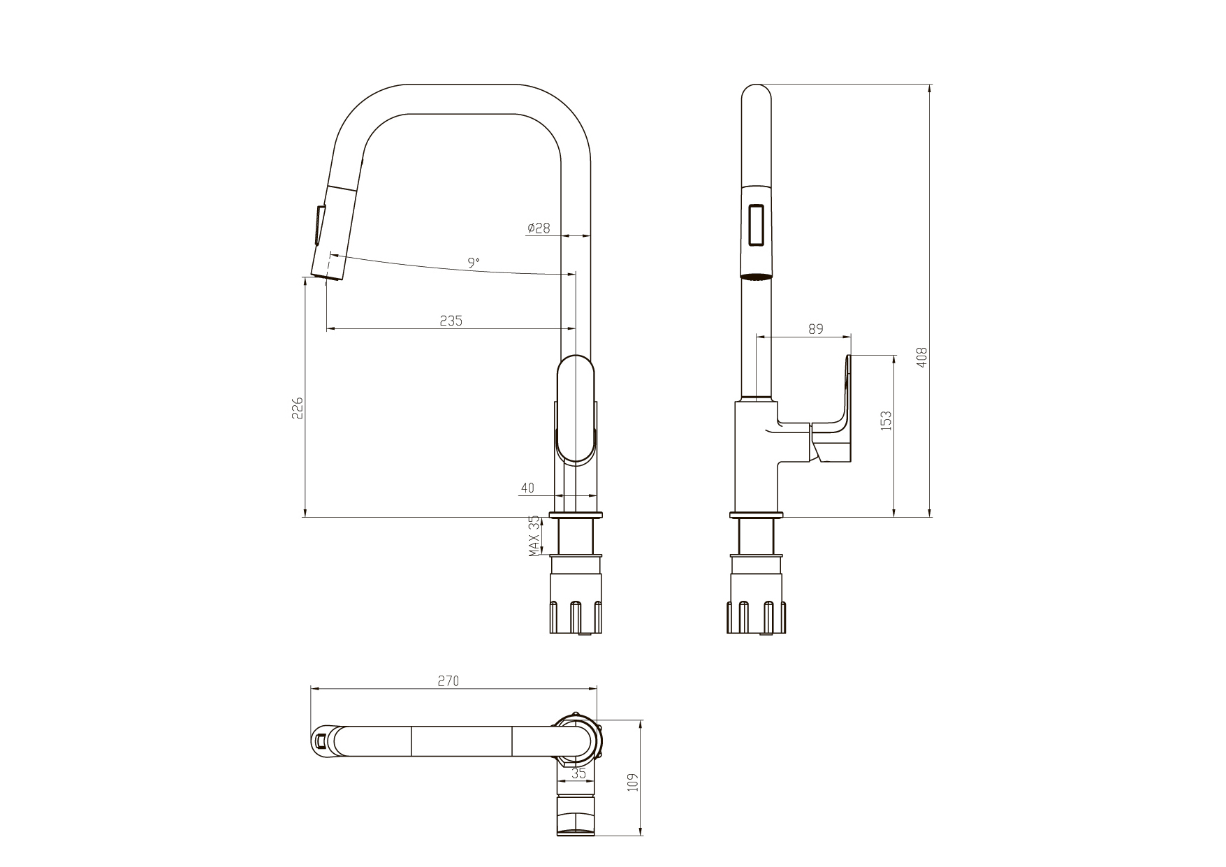 • поворотная головка выдвижного излива из нержавеющей стали