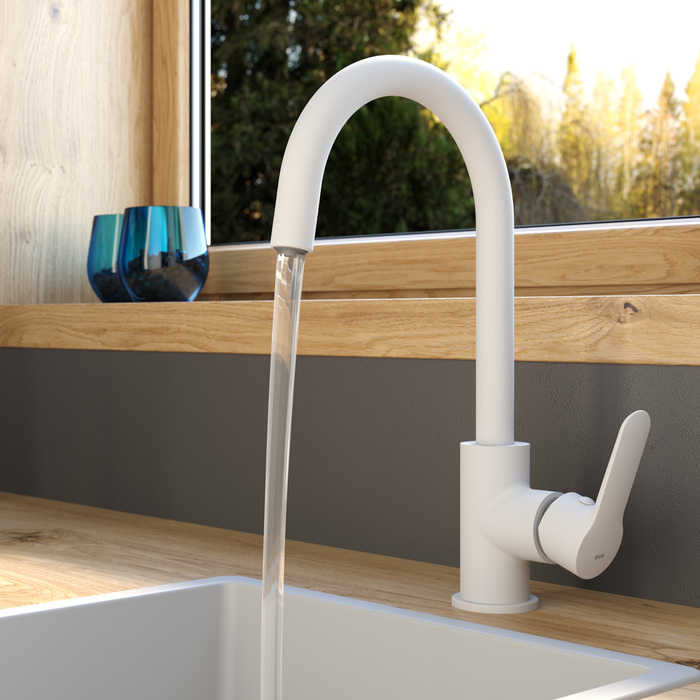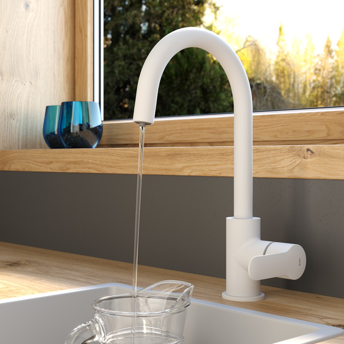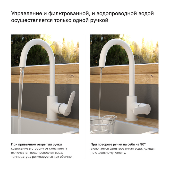 Однозахватный смеситель для кухни Cuba в актуальном матовом белом цвете имеет универсальный привлекательный дизайн и простую округлую форму излива. Смеситель оснащен отдельным каналом для фильтрованной воды и представляет уникальную технологию ее подачи, которая практически не имеет аналогов. Возможность подключения фильтра любого производителя позволит наслаждаться чистой водой прямо из смесителя простым поворотом ручки смесителя в закрытом состоянии. Отдельное отверстие в мойке под фильтр больше не потребуется.