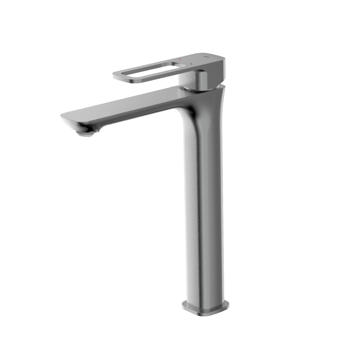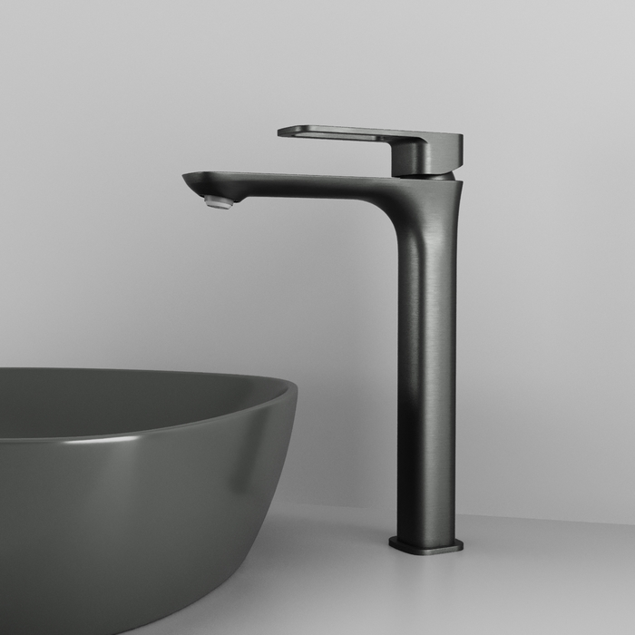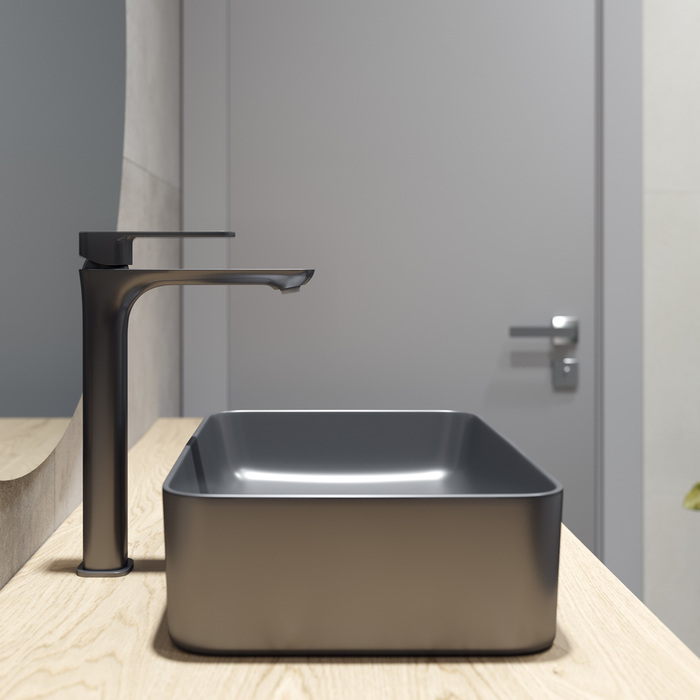 Высокий смеситель для настольного умывальника Slide в стильном графитовом цвете отлично дополнит настольный умывальник-чашу. Отверстие-петля на ручке выполняет декоративную и при этом практичную роль — ее легко захватить даже намыленной рукой и отрегулировать напор или температуру. Силиконовый аэратор эстетично скрыт в корпусе излива. В комплекте гибкая подводка и комплект крепежа.